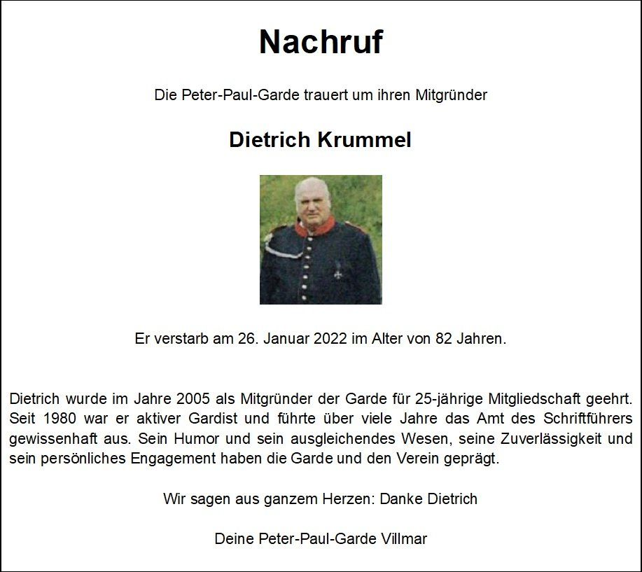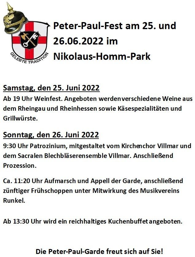 Das diesjährige Peter-Paul-Fest der Peter-Paul-Garde Villmar e. V. findet am Samstag, dem 25. Juni und Sonntag, dem 26. Juni 2022 statt. Das Fest beginnt um 16 Uhr mit dem traditionellen Böllerschießen. Um 19 Uhr erfolgt die Abholung des Majors Heinz Witterhold im Breitenweg mit Marsch zum Pfarrer-Homm-Park.
