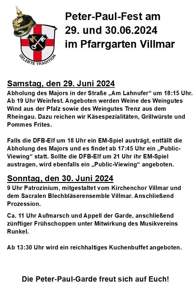 Das diesjährige Peter-Paul-Fest der Peter-Paul-Garde Villmar e. V. findet am Samstag, dem 28. Juni und Sonntag, dem 29. Juni 2025 statt. Das Fest beginnt um 16 Uhr mit dem traditionellen Böllerschießen. Um 18:15 Uhr erfolgt die Abholung des Majors Bernd Scheu in der Straße „Am Lahnufer“ mit Marsch zum Pfarrgarten Villmar.