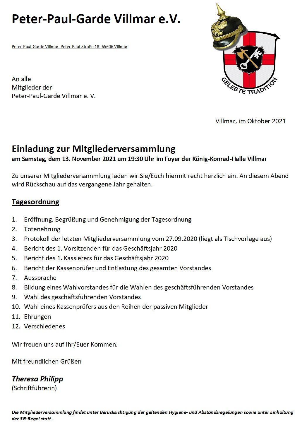 Protokoll der Mitgliederversammlung der Peter-Paul-Garde Villmar e.V. am Sonntag, dem