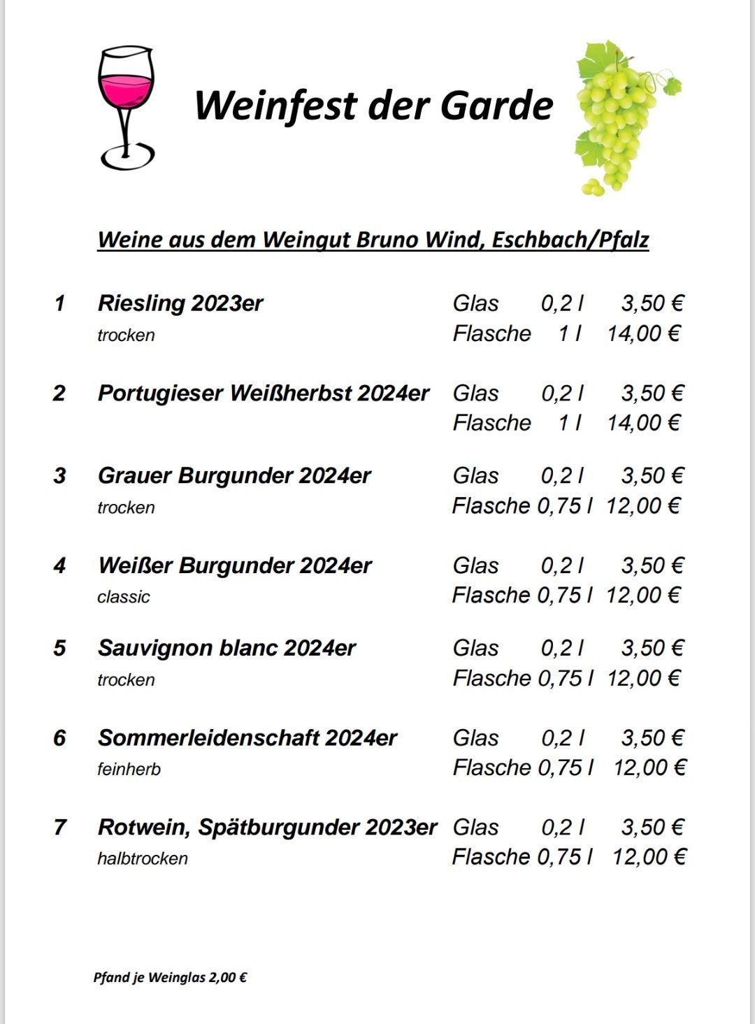 Um 19 Uhr beginnt das 6. Weinfest der Garde im Pfarrgarten. Neben Käsespezialitäten und Bratwürsten werden Weine aus der Pfalz angeboten.